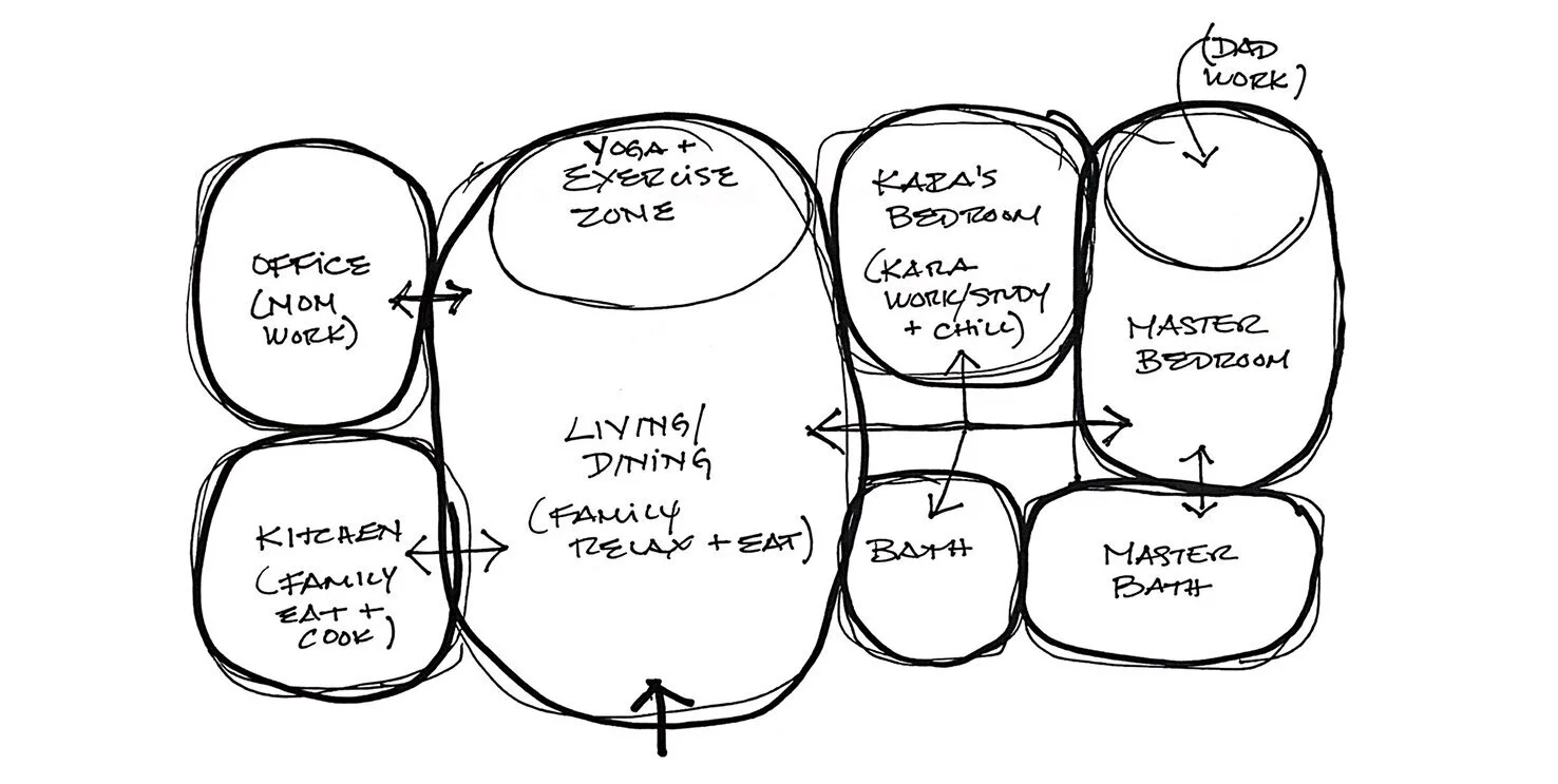 Grab a piece of paper and draw circles or squares to represent the different spaces and zones within your home or apartment. In design jargon, this is known as a bubble diagram (see example).